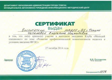 Сертификат участника выездного заседания Клуба "Молодой специалист", 2014 год