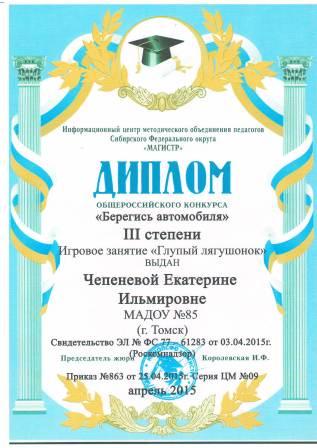 Диплом III степени общероссийского конкурса "Берегись автомобиля", 2015 год