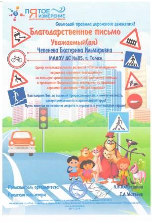 Благодарственное письмо за подготовку победителей в Всероссийской викторине по правилам дорожного движения "Юный пешеход", 2015