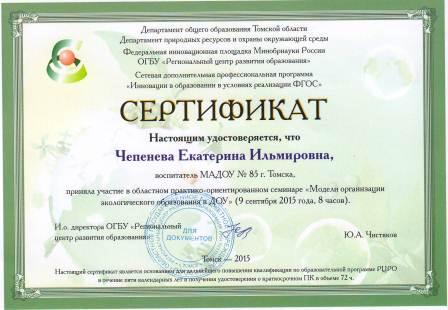 Сертификат участника областного практико - ориентированного семинара "модели организации экологического образования в ДОУ", 2015 год